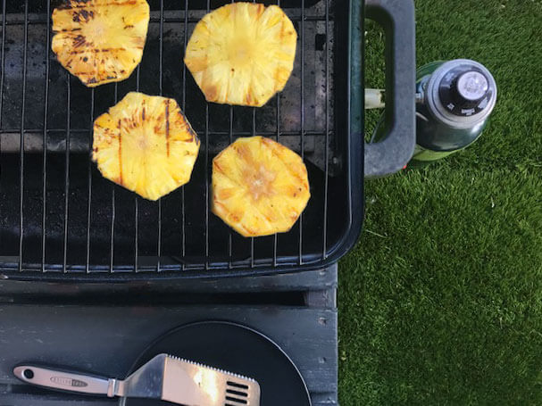 - Griller les tranches d’ananas 5 minutes de chaque côté ou jusqu’à ce qu’elles colorent.